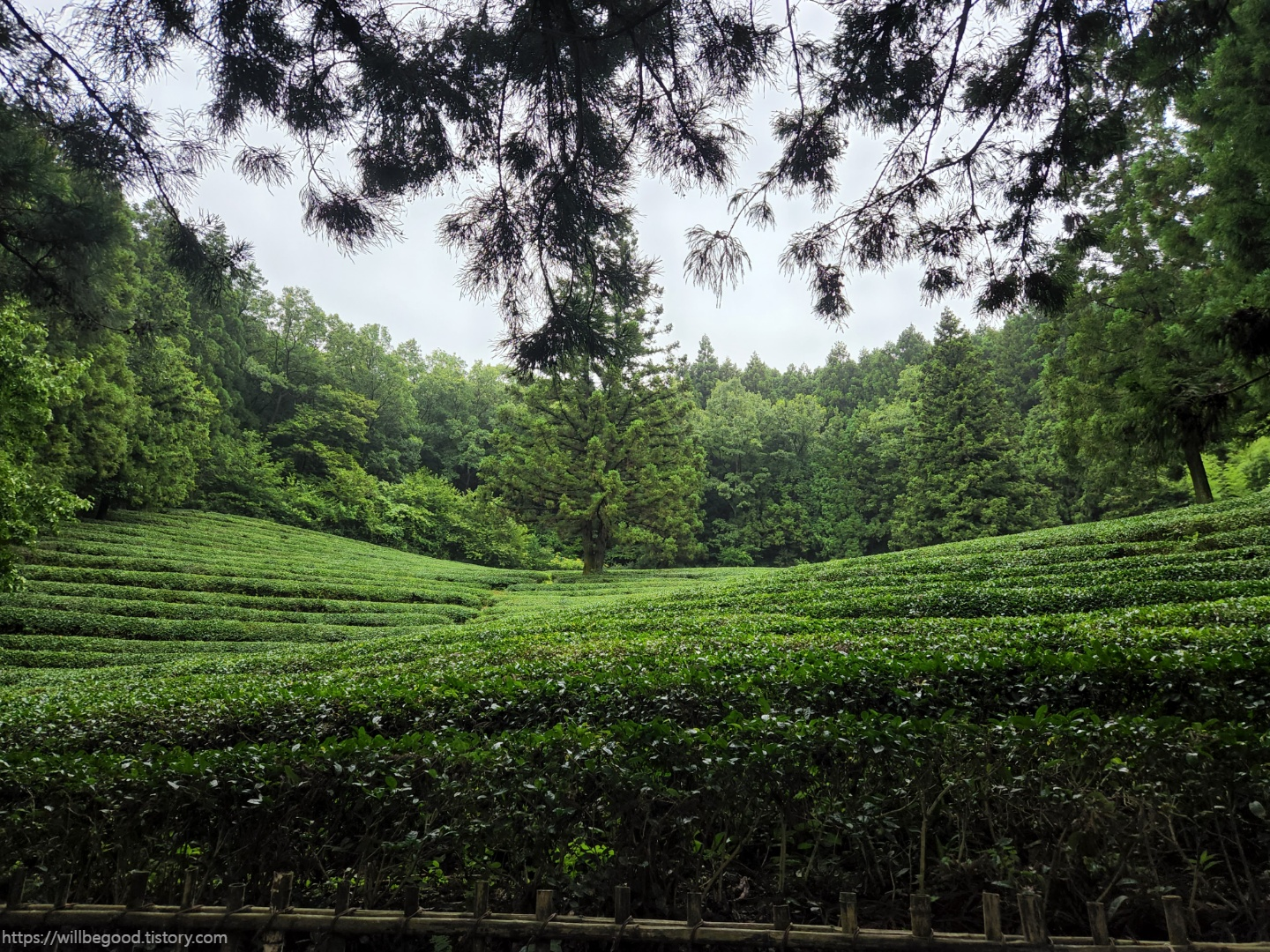우비 쓰고 척척 걸어서 차밭 중턱에 도달