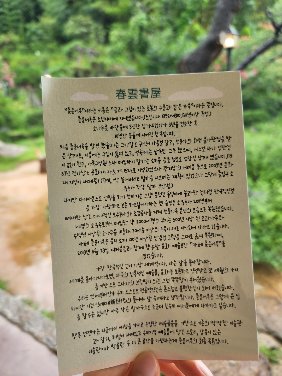 음료와 함께 춘운서옥의 유래가 담긴 카드 한 장씩을 주신다