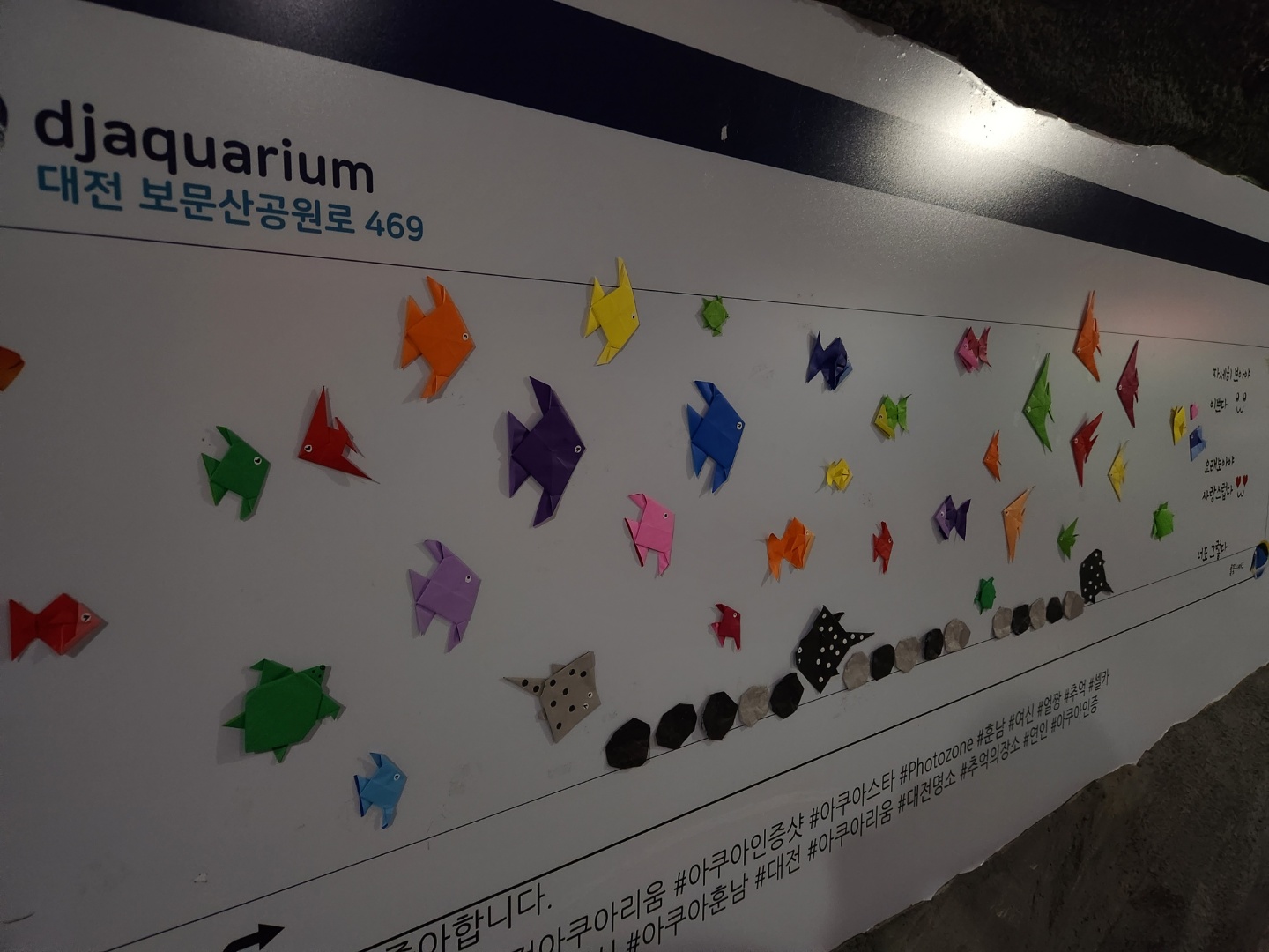 한국관으로 가는 길에 붙어있는 색종이 열대어 ㅋㅋㅋㅋㅋ