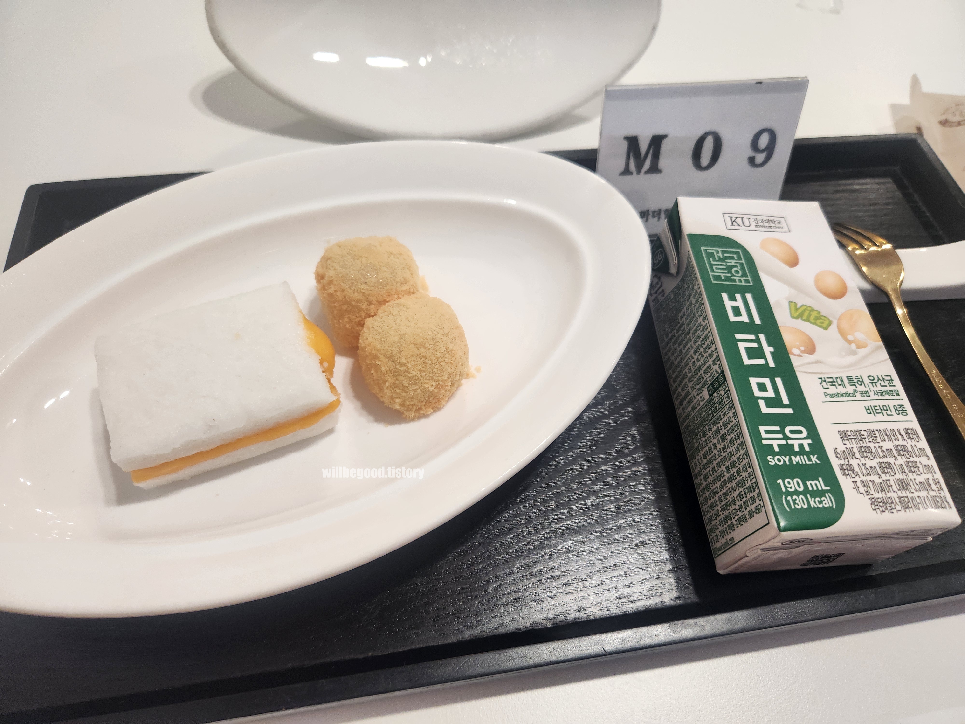 주먹밥, 과일, 토스트, 잼, 두유, 우유, 시리얼 등이